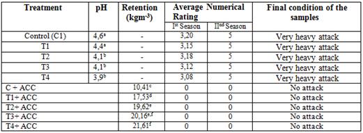 The specimens subjected to ACC preservative treatment at 689,47 kPa (100 lbs/in2) for 1h were sound after two seasons of exposure. Hence, data exhibited significant higher protection when MW treatment was given with ACC at the different intensity. These results corroborate our previous findings (Poonia et al. 2017), suggesting a synergistic effect between chemical and MW treatment for the improvement of termite durability. ACC preservative is effective even when specimens had not received any MW treatment. However, microwave treated wood resulted in remarkably high retention of preservative suggesting end use of wood even in drastic condition.