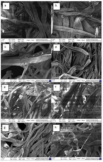 Before analysis of scanning electron microscopy, the XyzGeo71-bleached, LiPRHA1-bleached, XyzGeo71-LiPRHA1-bleached and nonbleached kraft pulp samples were sputter coated with a gold. Zeiss Evo LS10 sacnning electron microscope was used for morphological investigation of pulp samples. An operating voltage of 5 kV and secondary electron moade was selected. (Roncero et al. 2003a, Nagar et al. 2013).