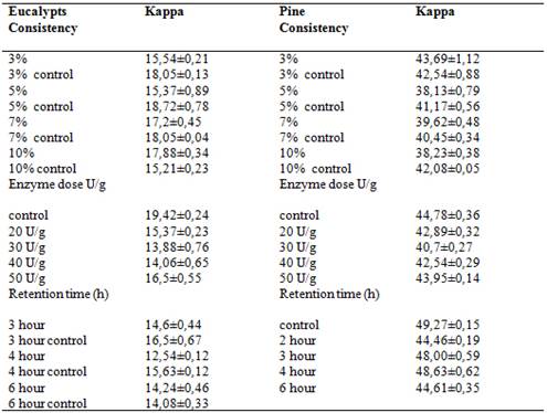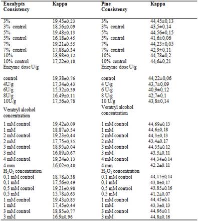 Specific parameters for the pretreatment of pine and eucalypts kraft pulp were optimized for each enzyme. Pretreatment conditions were adjusted for XyzGeo71 as 70°C, pH 7,0 and for LiPRHA1 as 40°C, pH 4,0. On the other hand, additional reaction parameters such as H2O2 concentration, veratryl alcohol concentration, consistency, enzyme dose, retention time, and the amount of oven-dried pulp were also optimized. To determine the effectiveness of different pretreatment processes, the kraft pulp samples were treated in polyethylene bags, washed with distilled water, and then were analyzed for the identification of Kappa numbers.