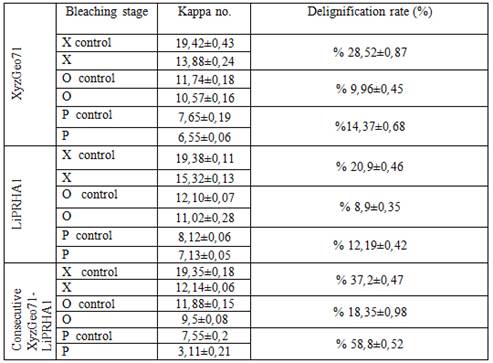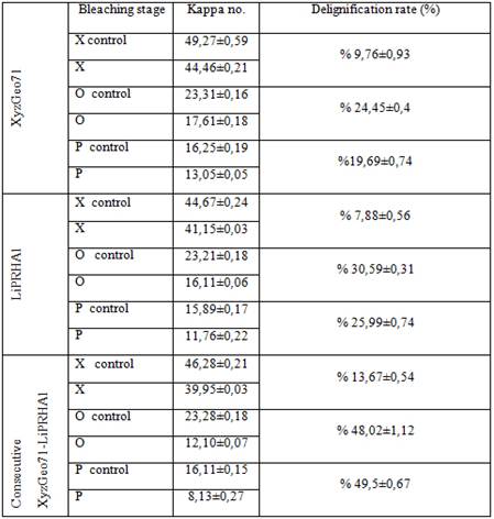 In this study, the conditions of oxygen delignification were applied as described previously in materials and methods section (chemical bleaching of kraft pulp). Following the oxygen delignification stage, the pine kraft pulp kappa number was reduced from 23,31 to 17,61 with XyzGeo71, 23,21 to 16,11 with LiPRHA1, and 23,28 to 12,10 with consecutive XyzGeo71 and LiPRHA1 treatment. The rate of delignification was determined as 24,45% 30,59% and 48,02% respectively. The eucalypts kraft pulp kappa number was reduced from 11,74 to 10,57 with XyzGeo71, 12,10 to 11,02 with LiPRHA1, and 11,88 to 9,5 with XyzGeo71-LiPRHA1. Futhermore, the rate of delignification was determined as 9,96%; 8,9% and 18,35; respectively.