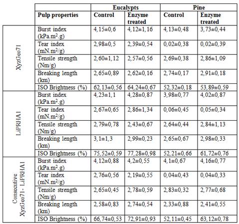 Paper samples were obtained from pulp with the Rapid-Köthen method and treated for 24 h in an air-conditioned room based on ISO 287. Standard optical and physical properties of each paper were then determined according to TAPPI standards. The pine and eucalypts kraft pulps were bleached using a totally chlorine-free (TCF) method. The pulps subjected to XOQP bleaching sequence showed relatively similar physical properties with control sample. According to results, breaking length, burst index, tear index, and tensile index of kraft pulp handsheets decreased partly after pulp biobleaching. In another words, no significant alterations were identified in the physical properties of enzyme-treated samples (Table 5). Following the bleaching stage, the changes in pulp properties were examined and compared with those of control samples treated identically except enzyme addition. The final gain in the brightness of enzyme-treated pine kraft pulp (54,89% ISO) was 2,57 points (52,32% ISO) for XyzGeo71, (61,72% ISO) 9,51 points (52,21% ISO) for LiPRHA1 and (63,12% ISO) 12,01 points (52,11% ISO) for consecutive XyzGeo71 and LiPRHA1 treatment and eucalypts kraft pulp (64,24% ISO) was 2,11 points (62,13% ISO) for XyzGeo71, (75,52% ISO) 1,76 points (77,28% ISO) for LiPRHA1 and (72,91% ISO) 6,17 points (66,74% ISO) for consecutive XyzGeo71 and LiPRHA1 treatment as shown in Table 5. As a result of this study; XyzGeo71, LiPRHA1, consecutive XyzGeo71 and LiPRHA1 treatment revealed 4,68%; 15,04%; 15,85% and 3,28%; 2,27%; 8,46% increase in brigthness on pine and eucalypts kraft pulp, respectively.