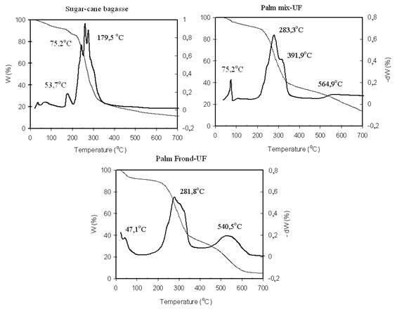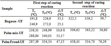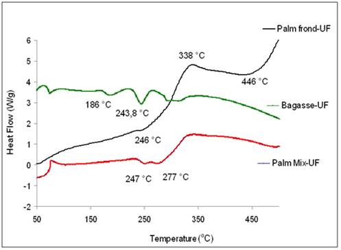 For application in industrial scale and to reduce the effect of extractives, further study was carried out on possibility of using frond and leafs in blend, as a precursor fibrous of MDF production. To recommend the possible using blend-based fibers, its interaction with UF should be studied, in comparison with both Palm frond and bagasse fibers. In this respect DSC and TGA of Fibers-UF samples were studied.