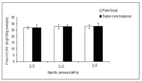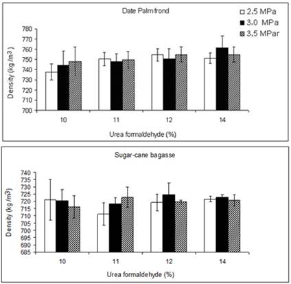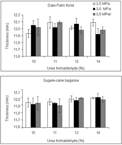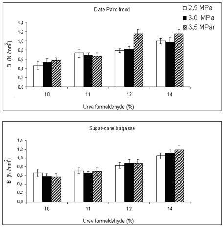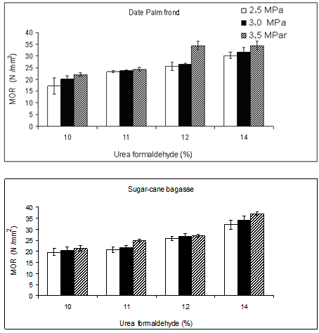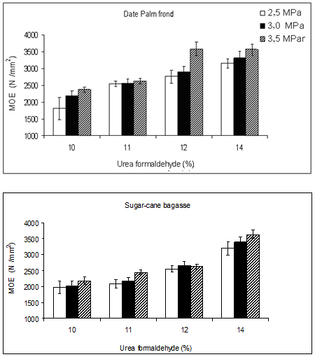 The explanation of the foregoing data may be ascribed to enhance the bond formation with increasing adhesive level and specific pressure, as well as due to the substrate constituents. Higher cellulose and hemicelluloses as well as lower extractives contents of sugar cane bagasse provide fibers easily adhered together during MDF formation, than Palm frond fibers. Higher adhesive level and pressing pressure enhancing the affinity of Palm frond fibers to response for adhering together during hot pressing.