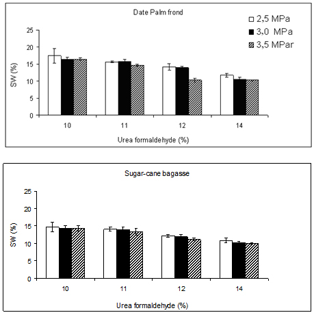 Results for the thickness swelling (SW) of the various MDF produced under the foregoing parameters are illustrated in Figure 8. It is clear that, the SW property of MDF decreased (improved) considerably as UF % increased from 10% to 14%. Greater reducing in this property is observed at relatively lower specific pressure (2,5 MPa), where SW decreased from 17 % to 11% and from 15% to 10%, in case of Palm frond- and Bagasse-based MDF, respectively. Increasing the applied specific pressure to 3,5 MPa, together with UF% up to 14% provides SW value ~10%, in both types of fibers-based MDF. However, the changing in pressing pressure is not significant on free-HCHO of MDF produced, where its value between 25,88 to 27,95 mg/100g board.