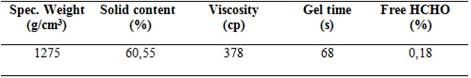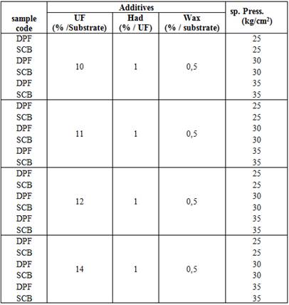 Different parameters of the MDF making involved different UF level (10-14%) and pressing pressure (25-35 kgf/cm2) were carried out, as shown in Table 1. The density of MDF was fixed by changing the amount of pressed fibers. The levels of UF were selected to provide MDF of E2 type with free-HCHO not exceed 27 mg/100 g board.