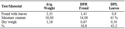 Date Palm rachises (DPR) were collected from date Palm trees grown up at Sinai. The used species is "EL BARMATODA". DPR were air dried in sun light for 48 hours, and then cut to 25x25x3 mm chips. These chips were softened by steam in a horizontal digester. The steam pressure was maintained at ~ 0,8 MPa for 6 min. then defibrated through ANDRITZ refiner parallel experiments, sugarcane bagasse (SCB) samples were also subjected to the same condition of digestion and refining. The softening fibers were sunlight dried and mixed through laboratory blender with different levels of urea formaldehyde (UF) adhesive (based on oven dry basis) ratios as shown in Table 1. The UF was delivered from Speria Co., with free-formaldehyde (HCHO) 0,18 %. The ammonium sulfate (1%based on UF) was added as hardener, followed by 1 % paraffin wax (based on dry fibers). The mats were formed and pre-pressed using 400 mm x400 mm box. Medium density fiberboard (MDF) boards with 12 mm thickness were made by hot pressing at different specific pressures condition as shown on Table 1, at 165 -170°C press temperature. For feasibility application such waste, the average weight of Palm fronds and Palm leaves in Palm waste are estimated and recorded in Table 2.