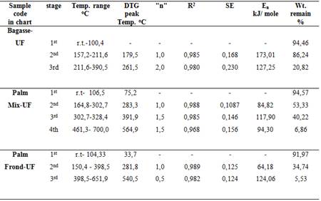With regard to the blend of Palm components (leafs + frond), it is observed that the volatilization is occurred in 2 stages with DTG peaks 283,3 oC and 391,9 oC; while the carbonization stage with DTG peak at 564,9 oC. This is probably related to the relatively higher extractives included Palm leafs, which resist to some extent the role of steam and digestion process, and consequently it may affects the individualization of the fibers and interaction with UF. This extractive leads to increase the activation energy required for volatilization stage (ΣEa = 202,7 kJ/mole) than the case of Palm frond (64,2 kJ/mole and bagasse 173,01kJ/mole, respectively).