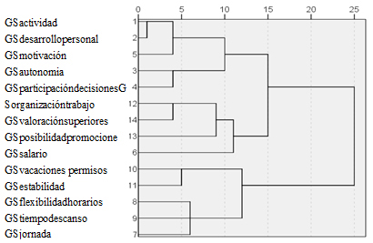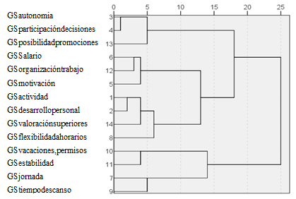 Una aplicación en una empresa de procesamiento de madera se debe a Faletar et al. (2016); en ese caso, los autores aplican esta misma metodología a los factores de motivación, utilizan también la representación de dendogramas del tipo de los que se exponen a continuación. Otros trabajos en los que se hace un estudio cluster en un tema de satisfacción pueden verse en Blachnio et al. (2016) y Van Aerden et al. (2016); este último utiliza los datos de la Encuesta Europea de condiciones de trabajo. Estos tres estudios tienen en común que aglutinan a los participantes o variables en grupos basados en su similitud.
