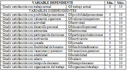 Se trató de explicar el grado de satisfacción con el trabajo actual a partir de varias variables independientes todas ellas referidas al trabajo, son todas cuantitativas y su escala toma valores de 0 a 10 (Tabla 1).