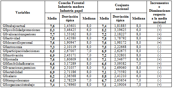 En el sector forestal, madera y papel, GSposibilidadpromociones es la variable que produce menos satisfacción al igual que en el conjunto nacional, probable consecuencia también del panorama de crisis último. Y la mayor satisfacción de los trabajadores forestales, de la madera y papel es la de trabajar en su actividad (7,8).