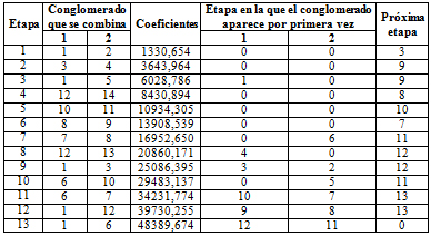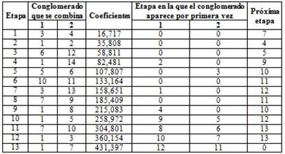 El análisis de conglomerados o cluster es un método estadístico que permite clasificar las variables en grupos basadosen su similitud (Grimm and Yarnold 2000). El historial de conglomeración es la tabla de los outputs que detallan el análisis de clusters (Tabla 5 y Tabla 6); ambas están en concordancia con los dendogramas siguientes (Figura 1 y Figura 2). En la primera columna se enumeran las etapas del análisis, las columnas segunda y tercera indican los conglomerados unidos en cada etapa (en la Tabla 5 por ejemplo, las variables 3 y 4 -GSautonomía y GSparticipacióndecisiones ‒ y las variables 1 y 2 ‒GSactividad y GSdesarrollopersonal‒ son las más homogéneas porque están a menos distancia). La columna cuarta es la distancia en la que se produce el agrupamiento; estos coeficientes están ordenados de menos a más distancia. La quinta y la sexta columna indican la etapa en la que el conglomerado aparece por primera vez, mientras que la última columna refleja en qué etapa volverá a utilizarse el agrupamiento. Hay agrupaciones muy tempranas en la primera distancia entre, por ejemplo, la variable 3 y 4 (GSautonomía y GSparticipacióndecisiones); por ello, la línea que las une está situada muy a la izquierda del gráfico. Estos agrupamientos están indicando una escasa distancia entre estos grados de satisfacción. El grupo anterior se une con la variable 13 (GSposibilidadpromociones), indicando que la agrupación se produce a una distancia mayor a la anterior, ya que cuando las líneas de unión se sitúan más a la derecha, más distancia existe entre esas variables. Sabiendo que a menor distancia los conglomerados son más homogéneos, resulta conveniente detener el proceso de unión cuando las líneas horizontales sean largas.