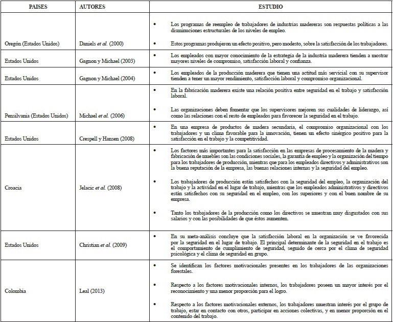 Para dar cumplimiento al objetivo general 2, planteamos una revisión de las aportaciones recientes de diferentes autores que estudiaron la satisfacción laboral en el sector forestal, madera y papel en distintos países, y obtuvimos los resultados que se esquematizan en la Tabla 8: