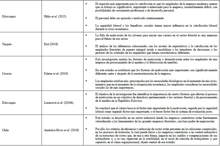 En un estudio de la satisfacción en el personal forestal, Erol (2016) afirma que las personas que trabajan en este sector, además de la generación de ingresos, tienen responsabilidades tales como la gestión ecológica, la sostenibilidad, el equilibrio y la satisfacción de las demandas sociales de la población. La falta de motivación de los jóvenes para iniciar una carrera en esta actividad es una amenaza para el futuro del sector forestal. En un artículo de una industria maderera, Pino-Pinochet et al. (2015) se puede leer que la motivación es también una de las políticas utilizadas por los directivos para mejorar la competitividad. La investigación de Faletar et al. (2016) analiza los distintos factores de motivación entre los empleados de una empresa de procesamiento de madera antes de la crisis y después de la recuperación económica, siendo la crisis la causante de esas diferencias. Otro trabajo de satisfacción laboral en el sector de la madera se debe a Lorincová et al. (2016a). Así como Jelačić et al. (2010) y Lorincová et al. (2016b) hacen un análisis de los factores de motivación en las empresas madereras, se debe a Hitka et al.(2014) y Kropivšek et al.(2011) el estudio del impacto de la crisis en los cambios de la motivación de los empleados del sector de la madera.