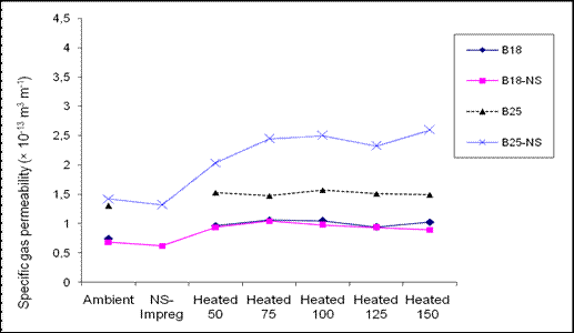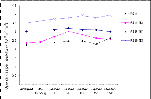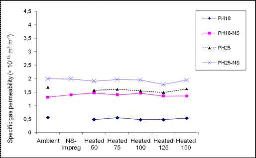 Regression analysis showed high significant R-square between nearly all gas permeability values measured when both the un-impregnated and nanosilver-impregnated specimens were heated at different heating steps versus the permeability value measured at ambient conditions (Table 1 and Table 2).
