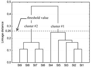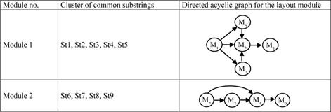 The common machine sequences, found in the routings for part groups, were subjected to cluster analysis next (step 3), that was performed using the appropriate module of data analysis system (Dell Statistica( Software, 2016). For that purpose, the agglomerative hierarchical clustering method with the unweighted pair-group average linkage algorithm (ALCA) was adopted. At the initial stage of related analysis in particular, the pairwise comparisons of the common substrings in terms of dissimilarity have been made, using the percent disagreement metric which is available in the aforementioned software module. Under such assumptions, the results of clustering could be provided in the form of a generated dendrogram (an inverted tree structure), as shown in Figure 4. Two clusters were extracted from the given data (Figure 4) before reaching the threshold value of the computed distance measure (as indicated with the bold dashed line), which terminated the action of the iterative algorithm. Based on the clustering results, and consistently with these in-prior studies on discrete manufacturing facility planning, two basic layout modules with specific material flow patterns could be formed. Those are depicted in terms of machine sequences, conveyed as directed acyclic graphs (Table 4), that exhibit no parts backtracking, correspondingly to the flow type production pattern (Siemiatkowski 2010). The inclusion of the residual machines was also due to be considered in this layout study (step 5 of the outlined procedure) to consistently develop the desired modular facility configuration.