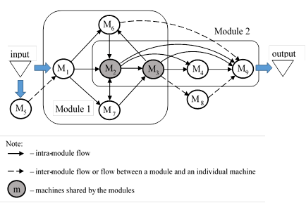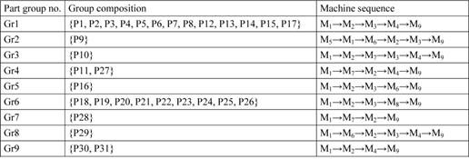 Material flow identification in the facility was needed: first to gain an understanding of its setup and operation, and then to develop a conceptual model of its decomposition into layout modules. The relevant spectrum of products manufactured in the facility was determined. It included 31 different part types (P1, P2, … , P31) which might occur as items of 11 various construction sets. The appropriate routings for parts have been mapped as machine sequences. Moreover parts that followed same routings were classified into 9 specific groups (Table 2).