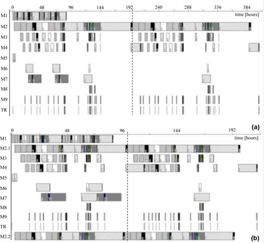 First, operational schedules were generated with regard to the baseline process layout and visualized in the form of Gantt charts, and then comparatively analysed in terms of standard quantitative parameters, such as: make span, average flow time for product batches and machine resource utilisation. Based on the workflow analysis, it was noted that for the baseline configuration, the cross-cut saw (machine M2) was always found as a process bottleneck, regardless of the composition of the production program. This was due to the longest cycle time for that machine as well as its use in processing all parts of the production spectrum (Table 5). The relatively low cost of the cross-cut saw (amounted to US$ 11,500) and the possibility for rapid return on this investment, justified the introduction of a second machine of this type. It was found, however, that duplication of that machine did not cause the bottleneck to shift to another workstation located in the facility. Correspondingly with the manufacturer's focus on the maximum diversification of the its market offer, the production flow was further studied by the scenario that assumed parts manufacture in the quantities required for the realization of the complete product spectrum (i.e. one item of each kind of toy sets). Accordingly, the aforementioned routines in production flow, inherent to the two tested process layouts, can be traced back in Figure 6.