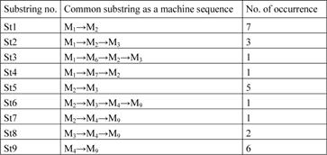 According to the established procedure (step 2), the needed identification of common substrings of machines between all pairs of operation sequences for part groups was made next. Given the routing data shown in Table 2, the common substrings of machines were discerned for the analysed case as well as the respective number of their occurrence (Table 3). A relevant applet application for finding common substrings in two operation sequences can be found among other in the reported paper of Irani and Huang (2006).