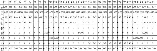 So formulated research problem involves an extensive use of Material Flow Analysis (MFA) that is aimed at the evaluation and rationalisation of material flow in production (Gould and Colwill, 2015). Methodical schemes applied to solve for the intended manufacturing layouts assume the input data model related to process routings for parts of a given spectrum P=(p1, … , pn) that can be represented by m-dimensional vectors xr = (xr1, … , xrm )T , xr