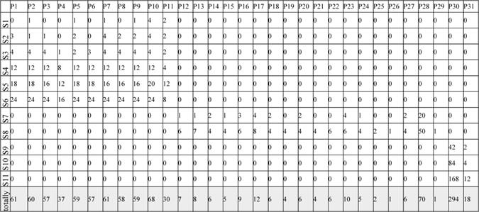 The number of part components involved in definite construction sets Sj, j=1, … , s, were in turn given in Table 6, based on which the corresponding input matrix