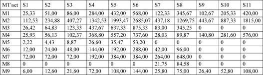 As a result, the matrix of work time consumed by each machine involved in manufacture of individual product items (construction sets) could be computed as a product of the input matrices, as follows: