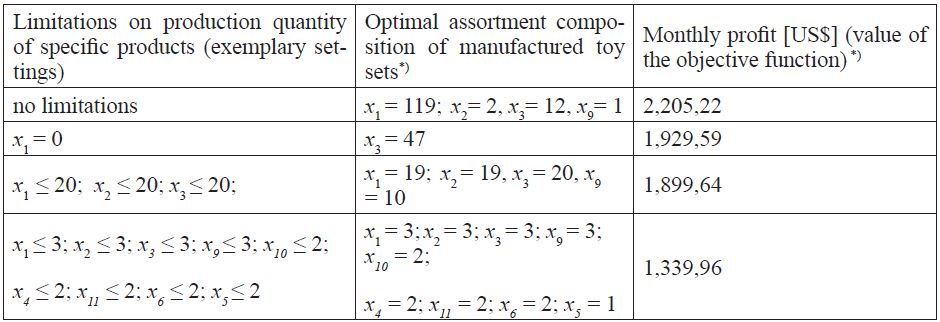 It was noticeable that the optimal assortment composition, possible to be found, is highly determined by is highly determined by the established limits of production quantity of particular product items. Moreover, wider diversification of product assortment required, as a rule, the determination of more limits in the ILP model, being in the line with the formal notation (6) as well as making adequate changes of those constraints in shorter time intervals.