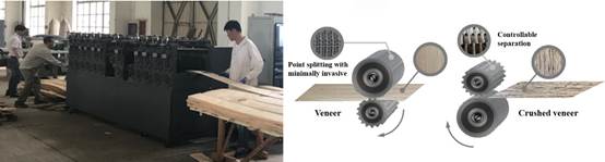 After debarking, the round-wood with a length of 2 m was peeled into veneers with different thickness (1,8 mm, 4 mm, 6 mm and 8 mm). Afterwards, the veneers were cut into strips with a width of 200 mm, then the veneers entered the crushing machine (Figure 1) to obtain the fluffed poplar veneers with a series of uniform linear-shaped cracks along the grain direction. The crushed veneers were dried in a kiln to approximately 10% of MC.
