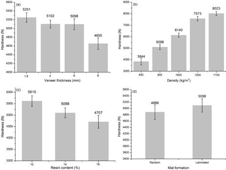 Hardness reflects the resistance of a material against indentation. Figure 2a shows the effect of veneer thickness on the hardness of NWRCs. In the case of density of 900 kg/m3 as well as resin content of 14%, the hardness of NWRCs gradually decreased with the increase in the thickness of veneers. The maximum decline (11,4%) appeared when the veneer thickness increased from 6 mm to 8 mm. The thicker the veneer, the more severe the cell wall collapsed during the fluffing process. Thus, the hardness of the product decreased when the veneers were manufactured into NWRCs.