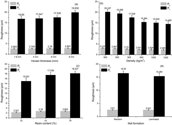 Figure 3a shows average values of roughness parameters obtained from the surfaces of NWRCs at different veneer thickness levels. The smoothest surface was observed in NWRCs of 2 mm-thick veneers (Ra=2,68 μm). The original surface quality of NWRCs were better than that of Pterocarya fraxinifolia LVL from 2,3-mm-thick rotary peeled veneers (Ra =6,83 μm) (Gungor et al. 2006) and that of Sorbus aucuparia L. LVL from 1,6-mm-thick veneers (Ra =5,13 μm) (Kol et al. 2009). The Ra value of the NWRCs decreased with increasing veneer thickness. As for LVL and plywood, the veneer thickness only had significant effects on the mechanical properties and dimensional stability of the panels (Melo 2014), while seemingly it had no effects on the surface quality. However, during the manufacturing process of NWRCs, the surface quality of the veneers was changed after fluffing. There were more cracks on the surface of the thick veneers which bore more pressure during the crushing process, thereby affecting the surface quality of the final products.