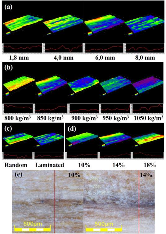 As density increased from 800 kg/cm3 to 1050 kg/cm3, the Ra value of NWRCs gradually decreased (Figure 3b). The increased density resulted in the enhancement of dense effect of the NWRCs, thereby leading to a more compact surface. Similar result was found by Akbulut and Koç (2004) in the study of MDF, of which increasing the panel density decreased the roughness of the profiled areas.