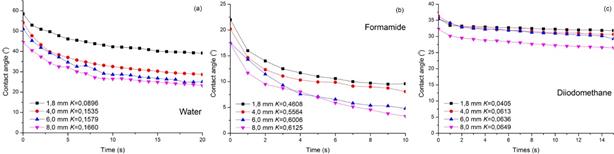 (4)The change of contact angle is caused by the extension and penetration of the liquid on the surface of the solid. Therefore, the K value can also be considered as the diffusion rate parameter of the liquid on the surface of the solid, which is used to characterize the extension and penetration rate of a liquid on a solid surface. The higher the K value, the more rapidly the contact angle reaches equilibrium and the faster the liquid penetrates and spreads, and vice versa. The K value of a particular liquid-solid system can be determined by curve-fitting the experimental data to Equation 4 using a nonlinear method (Huang et al. 2012).