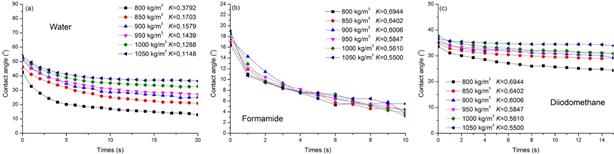 Figure 6 shows the dynamic contact angles by three different liquids as a function of a time for the NWRCs with different densities. The initial contact angle of NWRC was positively related to its density. The distilled water still showed the largest initial contact angle on the material surface, while formamide showed the smallest. The increase of contact angle could be attributed to the decrease of the surface roughness with rising the density.
