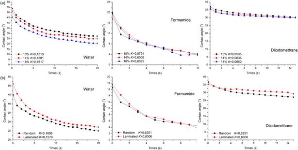 The distilled water showed the largest initial contact angle on the surface of the material, while formamide showed the smallest one. On the contrary, the K value for formamide was the highest, followed by the distilled water, the last was diiodomethane. Similar results were found by several researchers (Huang et al. 2012, Stehr et al. 2001). Huang et al (2012)found that formamide has the highest K values comparted with those of water and ethylene glycol. Stehr et al. (2001) stated that formamide is a strong hydrogen-bonding liquid that radically decreases the interfacial free energy at the liquid-solid interface through acid base interactions, thereby increasing the spreading and penetration rate. The change of surface contact angle is mainly caused by the acid-base ( 𝛾 𝐴𝐵 ) component of wetting liquid. Further, it is affected by the electron-donating component of the liquid ( 𝛾 𝐿 − ). The greater the 𝛾 𝐿 − value, the greater the change of contact angle, and the better the permeability. The influence of the veneer thickness on the contact angle of WRCs was mainly caused by the roughness, and the roughness of the surface geometry was the main factor to determine the surface wettability. According to the Wenzel theoretical model, for a given surface, the roughness factor of the surface has amplification effect on the surface wettability. Increasing the roughness would make the hydrophilic surface more hydrophilic, and the hydrophobic surface more hydrophobic. Therefore, the results of this study were also fully consistent with the Wenzel theory model. The increase of the veneer thickness led to the increase of the roughness, which improved the surface wettability of the material and reduced the contact angle.