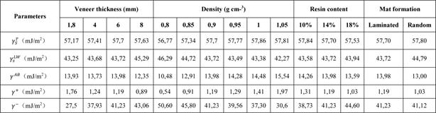 As seen from Table 2, the surface free energy of the material ( 𝛾 𝑆 𝑇 ) was composed of Lifshitz van der Waals force ( 𝛾 𝑆 𝐿𝑊 ) and acid base force ( 𝛾 𝐴𝐵 ), where 𝛾 𝑆 𝐿𝑊 occupied the main part. The size of the acid energy factor ( 𝛾 + ) and the basic energy factor ( 𝛾 − ) indicated the electronic granting ability and proton granting ability, respectively. With the increase of the veneer thickness, the surface free energy of NWRCs gradually increased attributable to the increase of 𝛾 𝑆 𝐿𝑊 . As the density increases, the surface free energy of NWRCs also increased, whereas 𝛾 𝑆 𝐿𝑊 gradually decreased. On the contrary, 𝛾 𝐴𝐵 increased, suggesting the increase of the surface polarity. With the increase of resin content, the surface free energy of NWRCs decreased slightly. The difference of the surface free energy was caused by 𝛾 𝐴𝐵 .