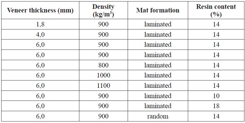 The crushed veneers were saturated in PF resin to achieve desired resin content (10%, 14% and 18%) and dried again to 12% MC. Cold-pressing and hot-curing were used in the forming process. The crushed veneers were weighed according to the desired density (900-1100 kg/m3) and then laminated or paved randomly along the grain direction in the mold. After being pressed in a cold pressing machine at room temperature, the veneers were placed in the air-circulated baking chamber at 120~130oC for 12 h to achieve the curing of PF resin. The obtained NWRCs with dimensions of 2000 mm (length) ×200 mm (width) ×150 mm (thickness) were conditioned in a chamber at 65% ±5% relative humidity (RH) at 20±2°C for 2 weeks before testing. Eight pieces of NWRC were manufactured under each condition, and five samples were cut from each NWRC. The conditions used for manufacturing NWRCs are listed in Table 1 in detail.