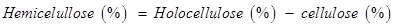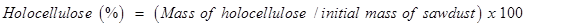 Heat treated and unheated wood samples were ground and the sawdust was extracted in Soxhlet apparatus for 24 h with different solvent of increasing polarity: dichloromethane, acetone, toluene/ethanol (2/1, v/v), and water. Crude extract was then analysed with a Clarus 500 Gas Chromatogram (Perkin Elmer) according to already published procedures (Kebbi-Bendeker et al. 2014). 1 to 2 mg of the dried extracts were silylated by adding 80 µL of BSTFA/TMSCl (99/1) and heated at 50°C for 12 hours. Then, the solvent was evaporated and extract derivatives were diluted in 1 mL ethyl acetate and transferred into a glass vials for gas chromatography analysis. GC-MS analysis was performed on a Clarus 500 gas chromatograph coupled to a Clarus 500 MS quadrupole mass spectrometer (Perkin Elmer Inc., USA). Gas chromatography was carried out on a 5% diphenyl / 95% dimethyl polysiloxane fused-silica capillary column (DB-5ms, 30m×0,25mm, 0,25µm film thickness, J&W Scientific, USA) with helium as carrier gas at a constant flow of 1mL/min. The gas chromatograph was equipped with an electronically controlled split/splitless injection port. The injection (1 µL) was performed at 250°C in the splitless mode. The oven temperature program was as follows: 80°C for two minutes; increase from 80°C to 190°C at a rate of 10°C/min; increase from 190°C to 280°C at a rate of 15°C/min and hold for five minutes; then 10°C/min until 300°C hold for fourteen minutes. Ionisation was achieved under the electron impact mode (70 eV ionisation energy). The source and transfer line temperatures were 250°C and 300°C, respectively. Detection was carried out in scan mode: m/z =45 to m/z=800. The detector was switched off in the initial two minutes (solvent delay). Compounds were identified by comparison with spectra from the NIST (US National Institute of Standards and Technology, Gaithersburg, MD, USA) mass spectral library (Edition of 2005). Only qualitative analyses based on Total Ion Current (TIC). Three samples were measured for each wood in chemical composition. Holocellulose analysis was made according to Rowell (2005), cellulose was determined by Kurschner and Hoffner method, and Klason lignin was determinate according to Akinosho et al. (2017). Extractive contents, holocellulose, cellulose, hemicellulose and klason lignin were determined using formula by Equation 2, Equation 3, Equation 4, Equation 5 , and Equation 6: