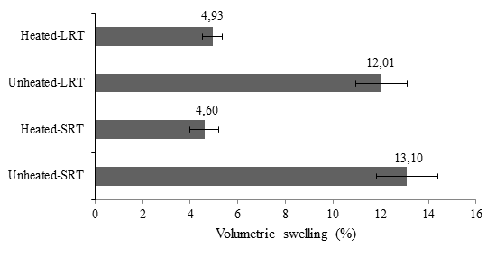 The volumetric swelling is one of the parameters for indicating dimensional stability (Figure 1). The swelling of unheated SRT (13,10%) was higher compared to that of unheated LRT (12,01%). After heat treatment, swelling of SRT and LRT decreased to be 4,60 % and 4,93% respectively. Anti-swelling efficiency (ASE) was difference in swelling between before and after treatment. The anti-swelling efficiency of SRT was greater than that of LRT, resulting in 64,87% and 58,93% respectively. SRT resulted in better ASE value than LRT and improved their dimensional stability. Chemical processes explained about the improvement of dimensional stability in heated teak. Hemicellulose has high hygroscopic behavior and is not resistant to high temperature, which is easily degraded at low temperature (Bekhta and Niemz 2003). Releasing acetic acid and reducing hydroxyl group in hemicellulose play an important role to decrease moisture content and accessibility of OH group (Vu and Li 2010, Rautkari et al. 2013). Therefore, the loss of hemicellulose in the heated woods could improve their stability.