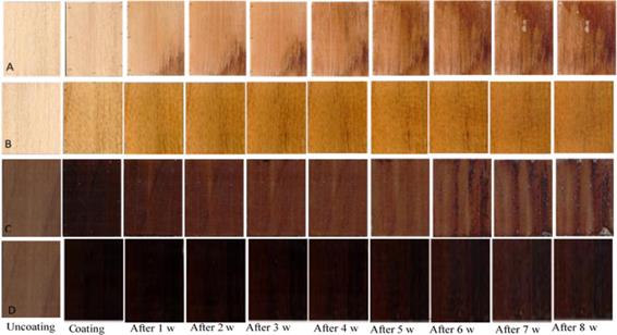 The dimensions of samples were 100 x 10 x 70 mm3 (L,T,R). In this study, we used commercial coatings, polyurethane water based and alkyd solvent based. For both finishes, two layers of coats were manually applied on wood with a brush. The first layer was dried after 4 hours for water-base coating and 24 hours for solvent-base coating. The second layer was applied after wood surface was sanded by sandpaper of 400 grit. The samples were air-dried for a week before being used for test. Wood samples were measured the color changes every weeks and the end of the test, wood samples were carried out scratch test.