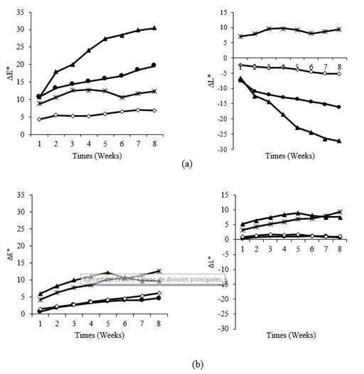 The evolution of aspect and colour for the different samples is shown in Figure 3 and Figure 4. Before weathering, the colour of SRT and LRT was greatly modified by heat treatment (important darkening) and also by the application of a water or solvent-based coating. Degradation of wood polymers (hemicellulose and lignin) and extractive compound were predicted to participate a color formation of wood heated, and similar reports were noted by Sundqvist and Moren (2002), Sehlstedt-Persson (2003). At the end of the test, the adhesion of water based coating was lower than the one of solvent-based coating. This was indicated by the apparition of cracks during the weathering process. Moreover, dark stains and white defects could be observed and appeared more rapidly on unheated wood samples covered by water-based coating. White defects indicated loss of coating adhesion and dark stain may originate from the migration of extractives. The water-soluble extractive migrated through wood substrate and water-based coating, and made yellow or brown discoloration on the coating surface. On the water-based coated unheated SRT, the dark colour appeared after the first week exposure (versus 5 weeks for unheated LRT), and it almost covered the entire surface of wood at the end of the exposure. For example, oak species coated by water-borne coatings presents also the problem of the extractive bleed because of the presence of phenolic compound such as tannins (Aloui et al. 2007).