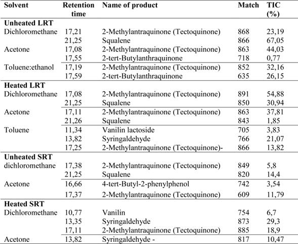 Qualitative analysis of extractives by GCMS (Table 3) showed that squalene was the main component in dichloromethane soluble extractives of unheated teak (67,05% and 14,4% relative to TIC (Total Ion Current) for LRT and for SRT, respectively). After heat treatment, squalene content decreased to 30,94% in the LRT, while squalene could not be detected anymore in the SRT. Both teaks contained 2-methylanthraquinone (tectoquinone), whereas 2-tert-butylanthraquinone was only found in unheated LRT. Windeisen et al. (2003) identified similar compounds (2-methylanthraquinone and 2-tert-butylanthraquinone) in teak wood acetone extract. Dichloromethane, acetone, and toluene/ethanol extracts of unheated LRT contained tectoquinone with a percentage ranging from 23,19 to 44,03%. Tectoquinone was only found in dichloromethane and acetone extracts (5,80 and 11,79% respectively) for unheated SRT. After heat treatment, the relative percentage of tectoquinone of SRT and LRT decreased in acetone and toluene-ethanol extract, while it increased in dichloromethane extract. This behaviour may be due to the higher thermal stability of tectoquinone compared to other components of dichloromethane extract.