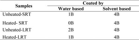 The adhesion of coatings after weathering was assessed according to the ASTM D-3359 (2007) standard. The results were reported in Table 4. The data showed a good adhesion for solvent-based coatings whatever the substrate, SRT or LRT, heated or unheated, since in all cases, the percentage of detachment was very low around less than 5% of area removed (4B). Conversely the adhesion of water-based coatings on heated or unheated was very bad both on SRT (1B /35-65% of area removed) and LRT (2B /15-35% of area removed). Surface layer of water-based coating had poor properties against aggressive factors, merely water during the condensation and water spray steps in weathering device. Indeed, water-based coatings contain hydrophilic substances that can be lixiviated hence a decrease of cohesiveness of the films and a loss of adherence. Solvent-based coating spreads completely during film formation even without the presence of solvent. The ease of spreading of solvent-based coating leads to beneficial substrate wetting and penetration in wood. Darmawan et al. (2018) found the lower equilibrium contact angle of solvent-based coating indicates that it should create more intimate contact on the wood surface than that of the water-based coating. However, Petrič et al. (2007) explained although hydrophobic character of oil-heated-treated Scot pine increase, exterior acrylic waterborne coatings show better wetting. Acrylic waterborne shows better performance after weathering for 5 years in heated wood than unheated wood (Jämsä et al. 2000). According to those explanation, bonding quality depended on application of coatings system. In this study, polyurethane waterborne was not suitable for exterior application, but this could be applied in interior application.