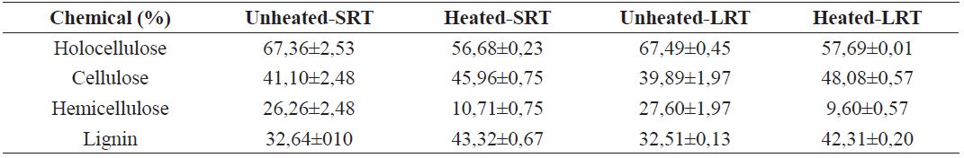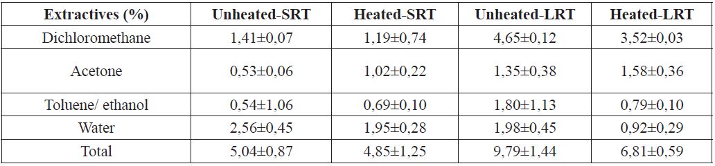 The total extractive content (TEC) of SRT was lower than that of LRT (Table 2). SRT in the age of 10 years contained only sapwood and juvenile wood. High proportion of heartwood was related to high total extractive contents. Darmawan et al. (2015) reported that SRT consist of 40% heartwood at 10 years old and LRT has 80% heartwood at 40 years old. The TEC of unheated SRT and LRT was 5,04 and 9,79%. The result was in the range of study of Lukmandaru and Takahashi (2008). Extractive contents were obtained by extraction using successively four solvent with increasing polarity. Dichloromethane, acetone, and toluene/ethanol extract of unheated SRT were lower than these of unheated LRT, except in water extract. This indicates that SRT contained high polar extractive compound compared to LRT. The reduction of polar compounds in the extractive shows transformation of sapwood to heartwood, while non-polar compounds in the extractives increase with the age of heartwood (Niamké et al. 2011).