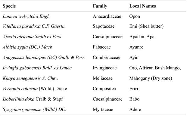 Ten different wood species were collected from Sawmills in Ilorin (Kwara state) and Mokwa (Niger State). These places fall within Guinea savannah regions of Nigeria. The wood Samples were first identified by the saw millers. The local identifications were further substantiated by the literature to obtain their corresponding scientific names. A list of the species used in the study with their local names is provided in Table 1. Wood samples were collected from logs whose diameter ranged from 60 - 105 centimetres. All of the wood samples were taken from mature wood. Special care was taken to ensure that species were accurately identified using both macroscopic and microscopic anatomical features such as colour, density, pores, among other.