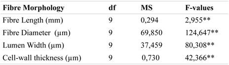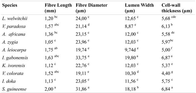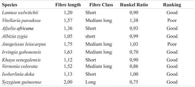 Fibre length and width of both woody and non-woody species vary depending on plant species and the plant part from which the fibre is derived (Illvessalo-Pfaffli 1995). The fibre morphological variations of the Nigerian guinea savannah timber species are presented in Table 2 and 3. The analysis of variance shows that there were significant differences in the fibre length, fibre diameter,