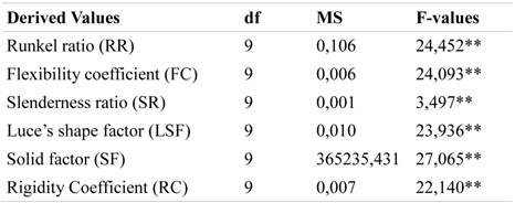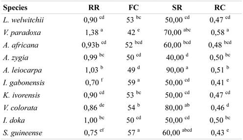 The results of the ANOVA showed that there was high significant variation in all the derived values (Table 4) while the DMR test (Table 5) revealed that L. welwitchii, A. africana,K. ivorensis had similar RR while A. zygia and I. doka also had similar runkel ratio, fibre flexibility and rigidity. FC, SR and RC of L. welwitchii and K. ivorensis were similar. I. gabonensis and S. guineense had the most flexible fibres (Table 7). A. leiocarpa had the most slender fibre. V. paradoxa fibres are the most rigid (Table 7).