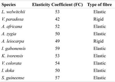 The degree of fibre bonding depends largely on flexibility and compressibility of individual fibre. Other calculated wood properties of importance are flexibility ratio and rigidity coefficient. Flexibility ratio is another important criterion for evaluating fibre quality. High flexibility shows that a material may be suitable to produce paper with greater burst and tensile strength. The higher the value of fibre length to width ratio, the greater will be the fibre flexibility and the chance of forming well bonded paper. Similarly, an increase in the rigidity of fibres results in decrease in fibre bonding. The flexibility of all the wood species are in the range of 42 and 59 with I. gabonensis having the highest (59%) followed by S. guineese (57%) (Table 7). This range is almost similar to (Brindha et al. 2012) where 60% was reported. Considering the FC > 0,55 (55%) acceptable value for papermaking fibre (Bektas et al. 1999), two of the species I. gabonensis and S. guineese will be suitable. However, flexibility ratio between 50 and 70 implies that the fibers can easily be flat and give good paper with high strength properties (Brindha et al. 2012). Therefore, V. paradoxa and A. leiocarpa may not be suitable due to their low FC of 42% and 49% respectively.