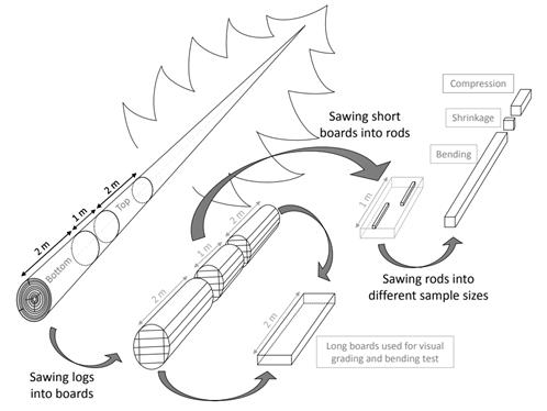 Sixty-two trees of Mountain pine (Pinus uncinata Ramond ex DC.) were harvested in nine representative forest plots (Table 1). For each tree a bottom log (2 m long), a middle log (1 m long) and a top log (2 m long) were crosscut (Figure 1). The logs were through-and-through sawn into 50 x 100 mm planks dried further in a conventional kiln to a mean moisture content of approx. 11%.