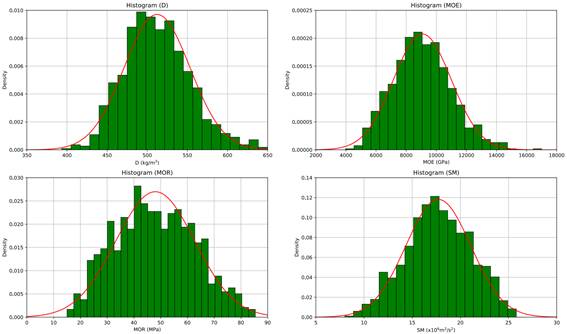 Histograms of D, MOR, MOE and SM (Figure 3) show that these values have a distribution close to a normal one.