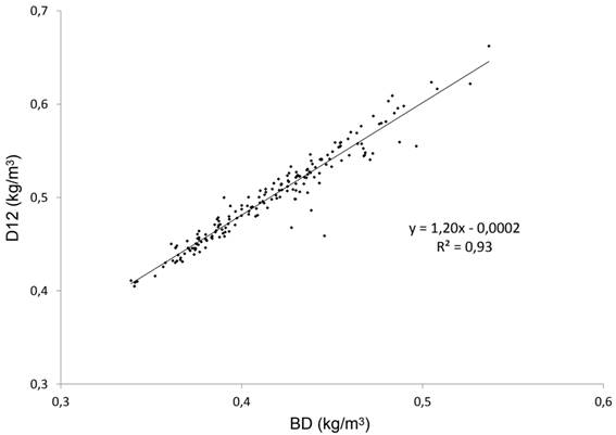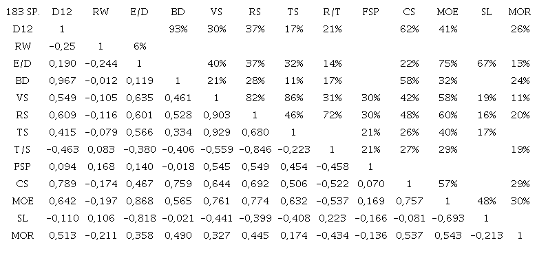 Table 9 gives the results of the correlation analysis. Significant correlation at levels better than 5% probability are very numerous, as expected for a large number of data in this field. The basic density (BD) and density at moisture equilibrium for the standard climate (D12) were very strongly correlated (R2=93%) in a proportional way (Figure 4)