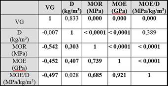 Table 4 gives the correlation coefficient between properties of the all listed boards. There is a significant negative correlation between the visual grade and the mechanical properties of the boards. Density was not correlated to visual grade; however, there are also significant positive correlations between density, strength and stiffness. Variations in MOE help to predict 55% of MOR, which is rather usual in mechanical grading (Hanhijärvi et al. 2005, Srpčič et al. 2009).